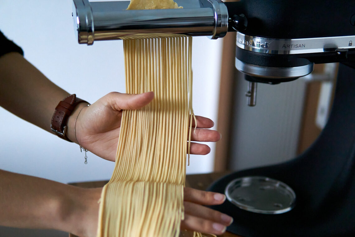 Clarissas Nudelteig ergibt perfekte, italienische Nudeln. Hier werden daraus Spaghetti gemacht, er ist aber universell einsetzbar.