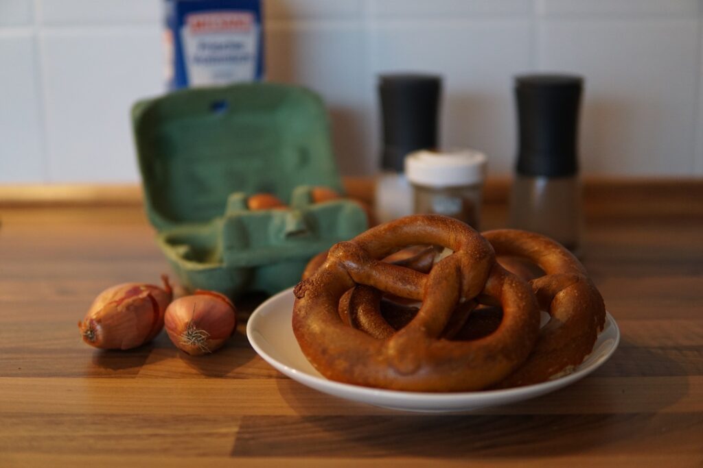 - Die Schalotten im Öl glasig dünsten und auf die Brezeln geben. Milch erwärmen und mit Muskat, Salz und Pfeffer würzen. Zusammen mit den Eiern auf die Brezeln geben und gut vermengen.