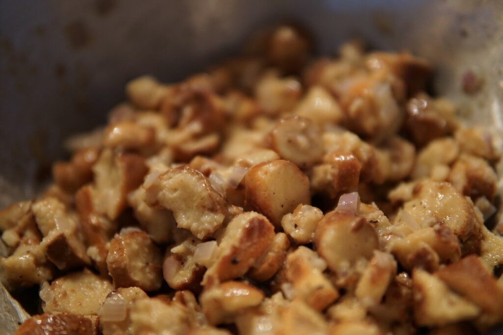 - Die Schalotten fein würfeln. Die Brezeln in kleine Stücke schneiden (Salz entfernen falls vorhanden).