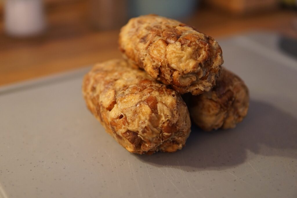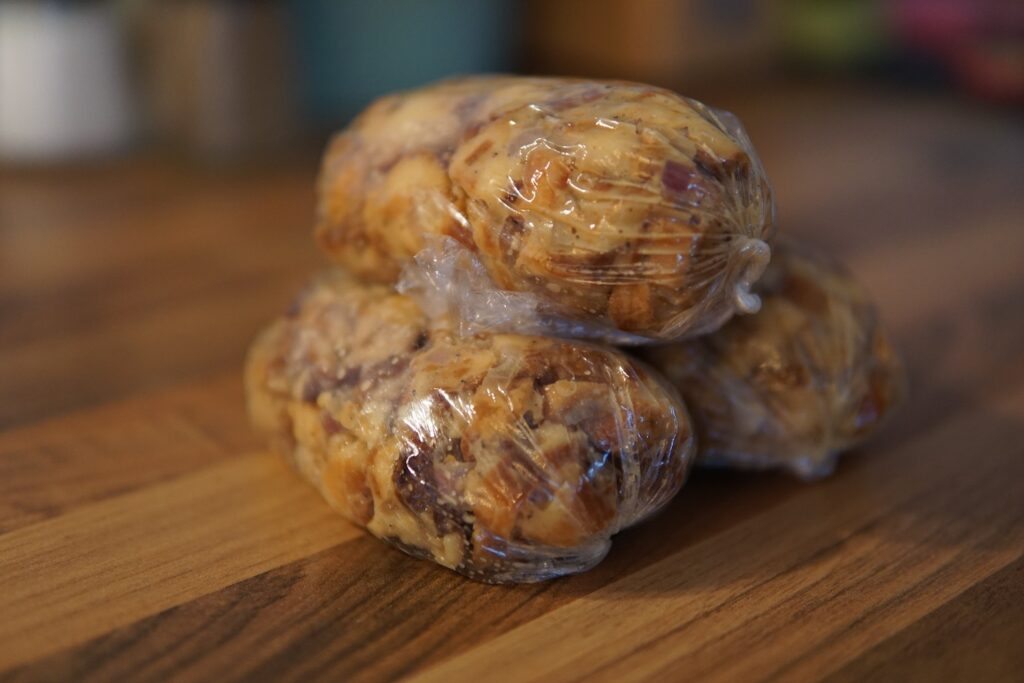 - Jeweils ungefähr ein Drittel der Masse auf Frischhaltefolie geben und einrollen.